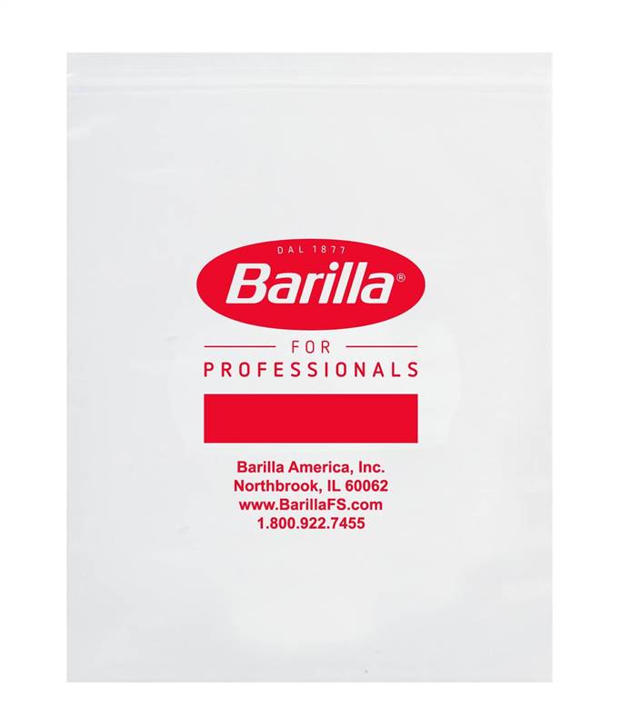 Barilla 10" x 13" sample bag. Resealable to keep items fresh and secure. Meets FDA and USDA specifications for direct food contact. Printed with the Barilla for Professionals logo and address. Sold in packs of 25.