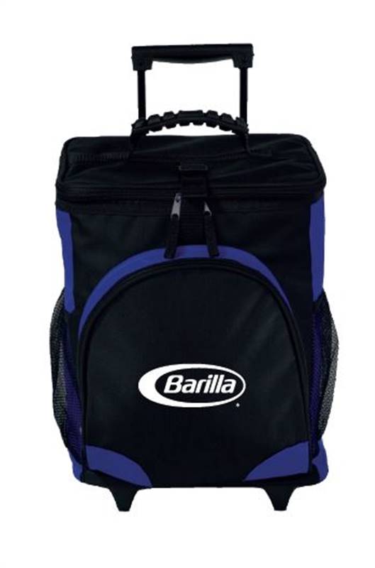 Measuring 14" x 12" x 8.25", this on the go rolling cooler can hold up to 24 cans of your favorite drinks. The front zippered and side mesh pockets provide additional storage space for snacks, utensils, and other small everyday items. The double inline wheels and telescopic handle enable easy transportation via rolling. With your custom logo printed on the front pocket, this cooler makes a great branded everyday and travel accessory. Printed with the Barilla logo.