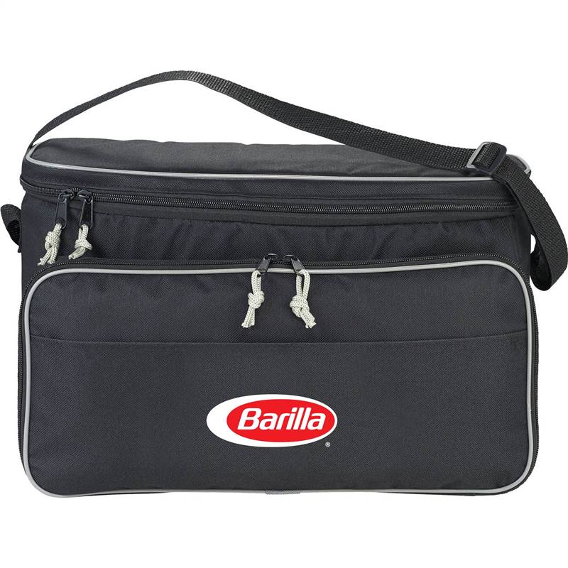 You can keep your food cold in the insulated main area while transporting it. When you're ready to cook, reach into the front zippered storage pocket for your fork, spatula, and tongs. Printed with the Barilla logo.