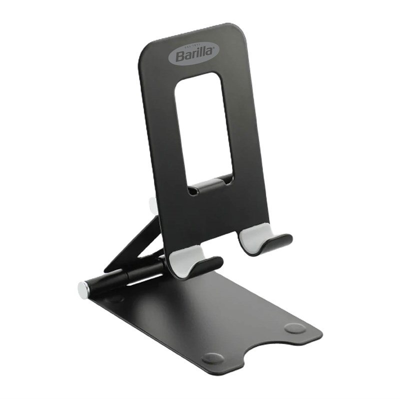 Keep your tablet or phone in sight with the Mobile Metal Phone Stand, which can adjust to give you the perfect viewing angle. When you're done using it, the stand can fold flat for easy transportation to and from the office. Can support phones and tablets up to 3/8" and 0.6 lbs. Engraved with the Barilla logo.